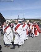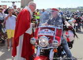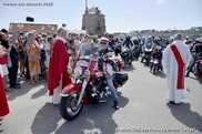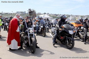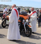 En 2023, je vous expliquais la différence entre pardon et bénédiction mais parlons de l'église emblématique de Camaret sur Mer. "Notre-Dame-de-Rocamadour" Les premières fondations ont été construites en 1183 d'après pas mal d'historiens, mais il serait imprudent de donner une date précise quant à la construction de l'édifice. Dans divers documents, on trouve des dates qui se contredisent. Aujourd'hui la partie la plus ancienne de la chapelle actuelle daterait de 1527. Ce lieu de culte doit son nom au socle de pierre sur lequel la chapelle a été construite au bout du Sillon, le Roc’h a ma dour du breton Roc'h = rocher, am a = au milieu, et Dour = eau, soit le "rocher au milieu des eaux". La chapelle, comme la tour Vauban, se trouvent sur un rocher relié à l'Esplanade Jim Sévellec par le "Sillon". Certains habitants de Camaret l'appellent "Roz Madou" qui a, sous une forme linguistique un peu différente, le même sens que roc au milieu des eaux. Quelle histoire ! La messe a lieu avec son cortège, ou ce trouve Heimdall qui porte un casque en souvenir d'un motard partie là-haut au pays des nuages du haut de ces 10 ans. Nous reviendrons avec Heimdall dans notre nouvelle rubrique "Les Potes sur la route", en fin de reportage.