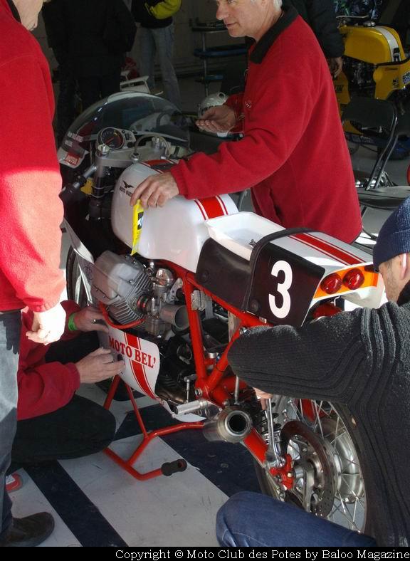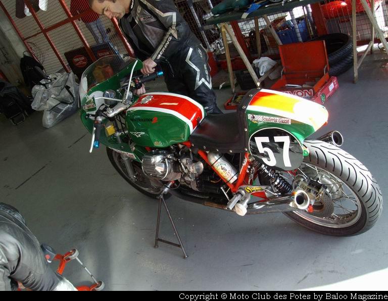 Il m'explique la préparation qui a été faite, et la différence qui peut exister avec les plus grosses écuries. Bardées de moyens, présentes dans le monde de la compétition depuis des années, elles fabriquent elles-mêmes leurs pièces spéciales pour finalement présenter en grille des machines affutées comme des bêtes de course et n'ayant plus grand-chose à voir avec la moto d'origine ou même avec la machine de l'époque. Bref, toute cette course à l'armement est a priori peu en rapport avec la philosophie de l'événement. En clair c'est l'éternelle histoire de David contre Goliath.