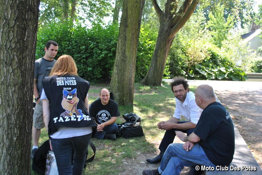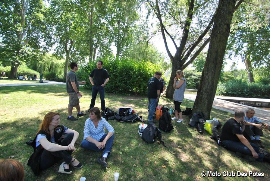 19 Potesses et Potes, pour une journée extraordinaire, Chris parti dans la nuit de sa Suisse natale pour nous rejoindre avec sa DB9-GT pour la première fois, car son 900 ZXR après avoir embrassé un camion sous le pont du Mont Blanc est un peu en vrac. Deubeulyou venu de sa Bourgogne, parti tôt le matin, Prince White qui débarque avec son Wabouz aussi pour la première fois au club, Morgane la mécano Bmiste à l'atelier du Roule Toujours. Nous avons construit sa légende en deux secondes sur le fait que tous les matins elle se muscle en soulevant un moteur de R75 "imaginez la scène" ….. Des moments comme celui-ci ont été notre lot toute la journée …. Ce qui est au top avec ce pique-nique sur Bercy qui en est à sa deuxième édition officielle, est qu’il permet aux nouveaux de venir faire connaissance avant de venir rouler avec nous. Souvent des personnes que je connais en dehors de la moto ou du club qui n'ont jamais passé le cap de venir voir, et ce qui et drôle c’est qu’à la suite ils y posent à 99% du temps leurs valises. Pour cette édition, on avait Chris dit aussi le petit suisse ou l'arracheur de bitume des alpages, Prince White le seul à qui on demande de venir avec un drapeau corse à un mariage, et arrive finalement avec un double balais arrimé sur son wabouz, avec un drapeau de 2 mètres de long sur 1,5m de haut et nous sort un « je n'ai pas trouvé plus petit ». Dire qu'il n'est pas passé inaperçu avec moi à cette époque qui, devant la mairie, étais parti à faire un wheeling en 1800 GL avec le marié en passager devant sa belle-famille, laquelle avait moyennement apprécié le concert d'échappements en rut mineur devilien et akrapovicien devant l'église , le tout avec ma musique corse à donf pendant le wheeling… un grand moment.