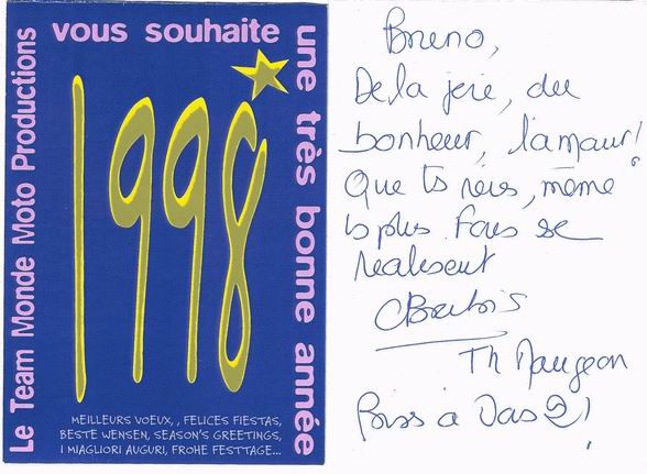 En fin d'année, comme pour toutes les années qui ont suivi, les plus grands noms du monde moto s'associent pour présenter leurs voeux à ce " Petit Moto Club de Quartier " comme s'obstinent à l'appeler ses détracteurs. Rapide panorama au fil des ans :
