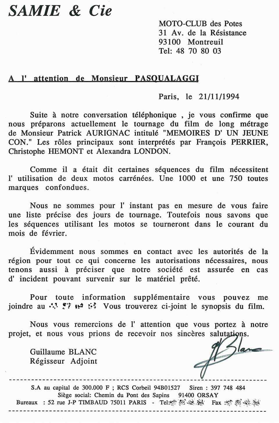 Mais pour l'instant, le Club continue paisiblement son ascension vers la popularité. Pas en reste avec le septième art, le Moto Club apporte cette fois son aide au tournage du film " Mémoires d'un jeune con " pour lequel il prête deux moto.